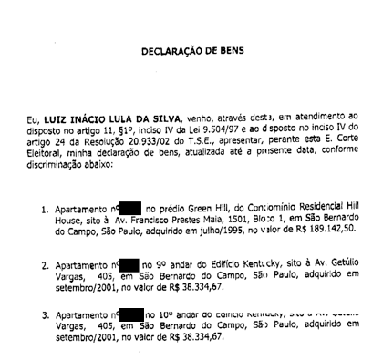 A) A declaração de bens de Lula ao TSE em 2002, quando ele foi candidato à Presidência da República. A íntegra pode ser consultada em http://download.uol.com.br/fernandorodrigues/politicosdobrasil/2002/59-02.pdf: