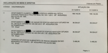 B) A última declaração de bens de Lula, apresentada à Receita Federal em 2015: