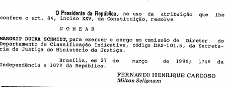 Conforme demonstrou o Tijolaço, sua primeira nomeação foi feita pelo próprio FHC, em 27 de março de 1995, para o cargo em comissão de diretora do Departamento de Classificação Indicativa, no Ministério da Justiça.