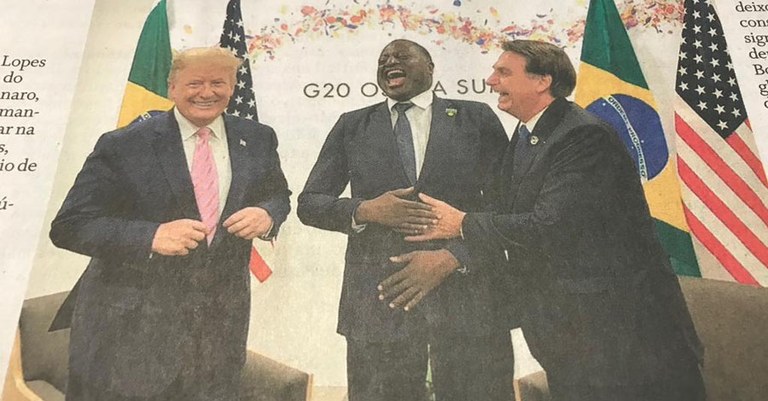 A resposta para a pergunta, que compara Obama ao político brasileiro pela cor, é uma foto que fez sucesso na internet. Na imagem, Bolsonaro e Helio gargalham. Trump, mais contido, ri. Interlocutores do deputado e do presidente confirmaram ao GLOBO o diálogo.