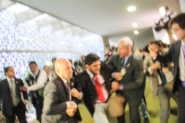 Na ação o Secretário-Geral da UNE e militante do Levante Popular da Juventude Thiago Ferreira e a militante do Levante, Carla Bueno foram detidos pela polícia legislativa, escutados e liberados logo depois.