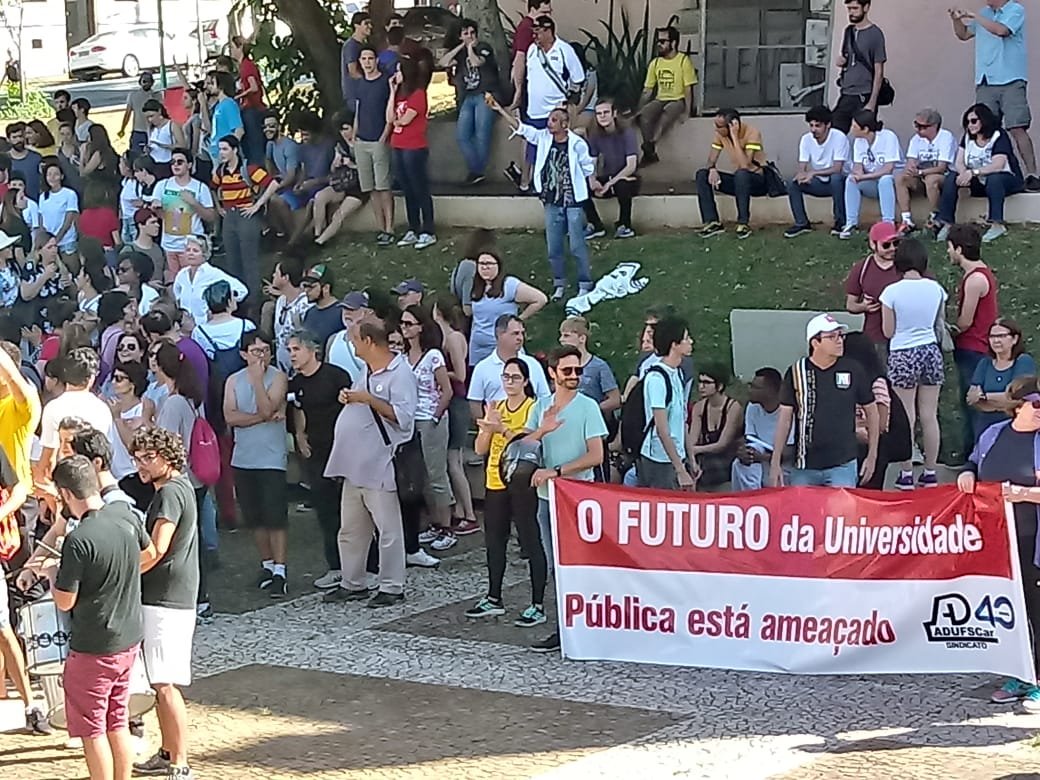 11h44 - Em São Carlos (SP), estudantes marcham contra os cortes na Educação e a reforma da Previdência:
