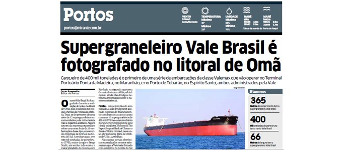 Aí fui procurar e achei o Blog Mercante e no jornal O Estado do Maranhão as imagens do “Vale Brasil”, com bandeira de Singapura, fazendo testes no litoral de Omã, justamente para onde a Vale vai exportar minério bruto brasileiro para ser beneficiado lá e vendido às aciarias da China.