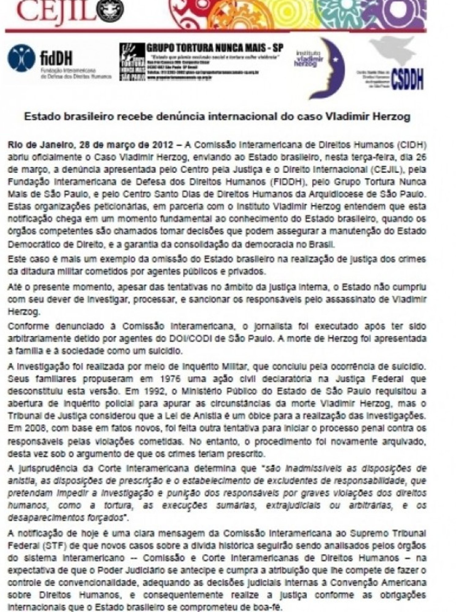 A denúncia foi feita a pedido do Cejil (Centro de Justiça e Direito Internacional), do Grupo Tortura Nunca Mais de São Paulo, do Centro Santo Dias e da Federação Interamericana de Direitos Humanos.