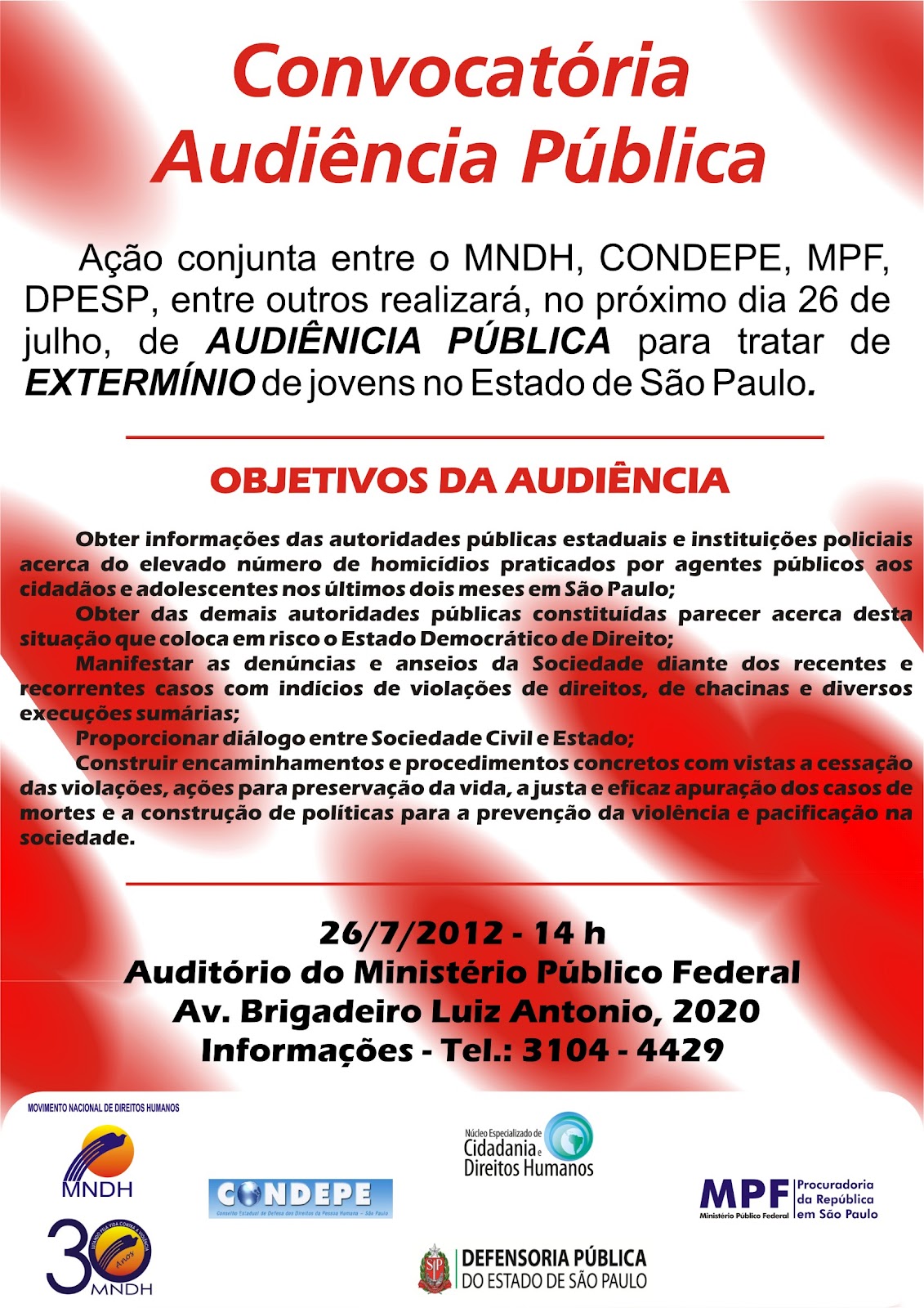 A audiência acontecerá no dia 26 de julho de 2012 - 14 horas no auditório do prédio do Ministério Público Federal, Av. Brigadeiro Luiz Antonio, 2020, Bairro Cerqueira Cesar, nesta Capital de São Paulo.