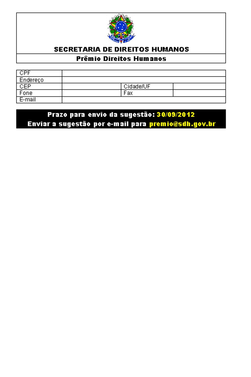 As indicações para o Prêmio Nacional de Direitos Humanos devem ser feitas em formulários produzidos pela SEDH. Aqueles que quiserem somar-se à iniciativa do Dr. Konder Comparato e do escritor Fernando Morais; de João Pedro Stédile e Amelinha Telles; de Paulo Henrique Amorim e de Perly Cipriano, são convidados a fazê-lo colocando seus próprios dados no formulário que eles preencheram e que vai anexo a esta mensagem. O formulário deverá ser enviado ao endereço eletrônico [email protected].