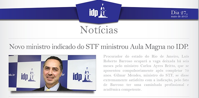 Na peça comercial, o IDP saúda o novo Ministro como autor de uma conferência na instituição.