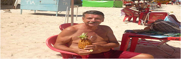 O coronel Mato aparece sorridente numa foto, de bermuda vermelha, sem camiseta, empunhando um abacaxi com canudinho, sob um guarda-sol em alguma praia do litoral do Brasil. Atrás dele, há uma armação de madeira em azul onde se pode ler parte da propaganda: "... da tia". Em bom português.