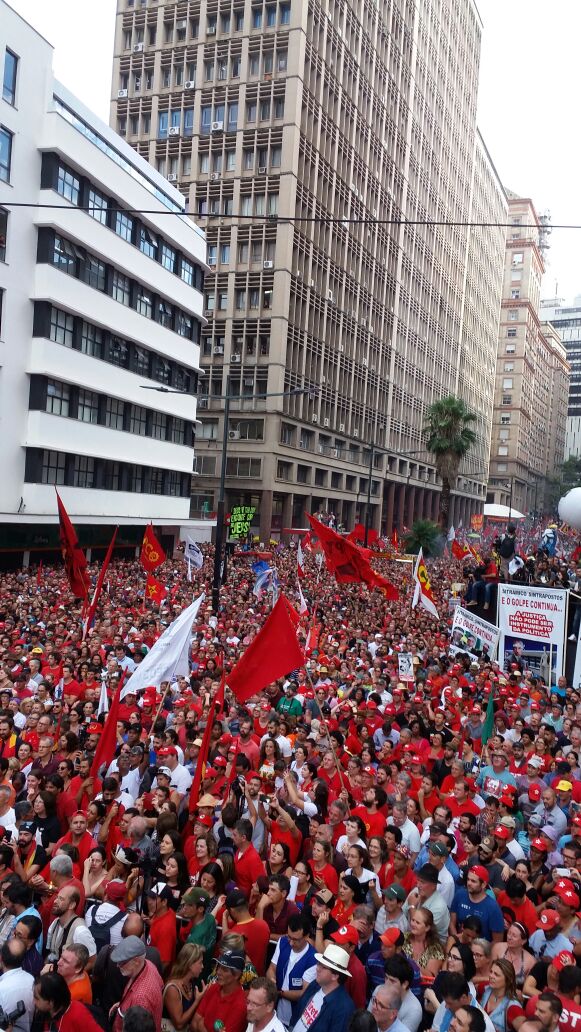 13:33: O sol forte em Porto Alegre não dispersou a manifestação.