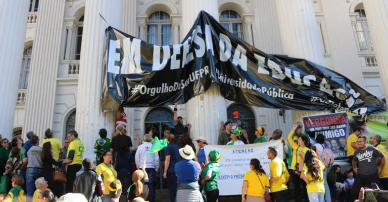 Manifestantes bolsonaristas arrancam a faixa "Em Defesa da Educação", na frente do prédio da UFPR, Curitiba, 26/V (Reprodução: Hora do Povo)