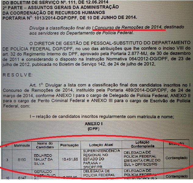 (Documento de junho de 2014 anunciando a transferência de Eduardo Mauat para a Delegacia de Polícia Federal de Santa Cruz do Sul (RS). Foi uma transferência a pedido,mas ele, pelo que informaram na própria delegacia, pouco apareceu por lá. É normal, isto?)