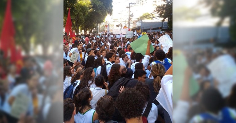 Na Tijuca, Rio de Janeiro, alunos do Colégio Pedro II protestam contra os cortes de Bolsonaro no orçamento da educação (Créditos: Facebook/Lindbergh Farias)