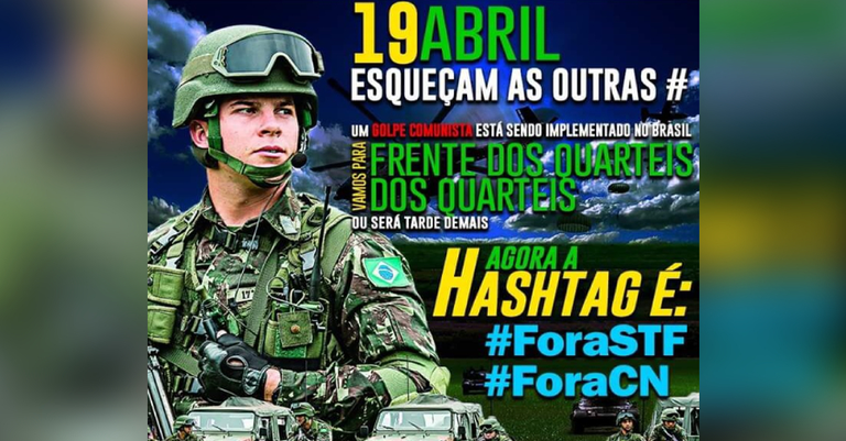 “O momento é grave e só poderemos contar com as nossas Forças Armadas para fechar as instituições, o Congresso Nacional, o STF, os STJs, governos estaduais, municipais, as câmaras de vereadores e deputados de todo o Brasil, conservando o cargo do presidente e seus ministros que não estão podendo exercer os seus projetos de governo para o bem da nação brasileira”, diz vídeo divulgado pela página “Brasil, Pátria Livre do Comunismo”, que agrega discursos de bolsonaristas no Youtube.