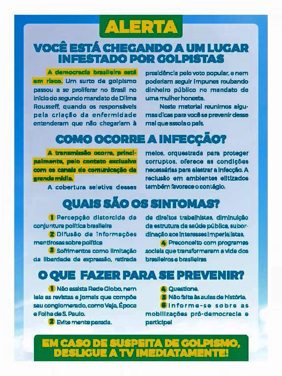 Brasil Você está aqui: Página Inicial / Brasil / Cuidado: Golpismo mata! Cuidado: Golpismo mata!Não assista à Globo (nem ao Galvão!) Tweet Compartilhar Compartilhar Email publicado 13/06/2016 Comments Conteúdo relacionado Peru 1 vs 0 CBF, Globo, Lei do Passe e Corinthians