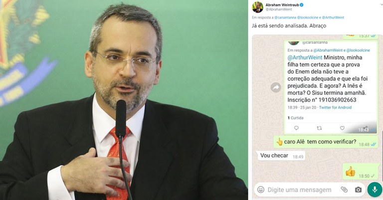 No sábado, Weintraub determinou que o Instituto Nacional de Estudos e Pesquisas Educacionais Anísio Teixeira (Inep) verificasse se estava correta a nota da prova do Enem de uma candidata após receber pedido do pai dela pelo Twitter. Carlos Santanna, apoiador do governo de Jair Bolsonaro, postou na rede social uma reclamação, marcando o perfil de Weintraub.