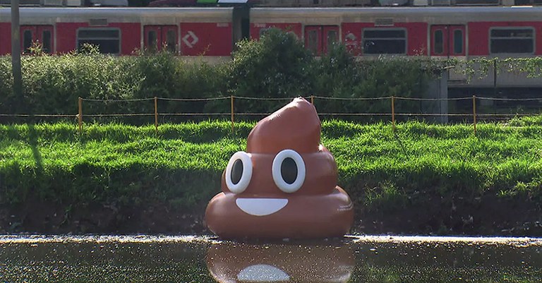 Um "emoji" flutuante foi a estrela de um bem-humorado protesto contra a poluição no Rio Pinheiros, em março de 2018 (Reprodução: Rede Globo)