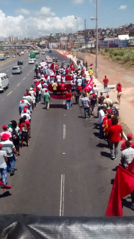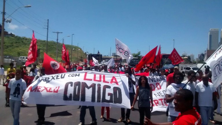 Nós estamos fazendo uma grande marcha no centro da cidade, e fazemos um protesto contra esse terrorismo que está sendo feito por parte da Rede Globo, do Poder Judiciário. Querem absolver os verdadeiros criminosos desse país e condenar os movimentos sociais e as lideranças de esquerda, inclusive o presidente Lula.