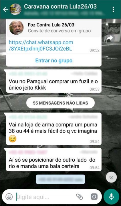 Horas depois, às 23h38, um outro integrante enviou a seguinte mensagem: Tem que meter bala, aproveita que tá de noite, mirar nos pneus, motor e Bala”. Paralelamente, no grupo “Foz contra Lula 26/03”, às 10h53 da mesma segunda-feira, um integrante do grupo mandou a mensagem “Onde arruma esses miguelitos?”. Um segundo integrante respondeu: “Não vamos dar chance nem deles descerem do ônibus”.