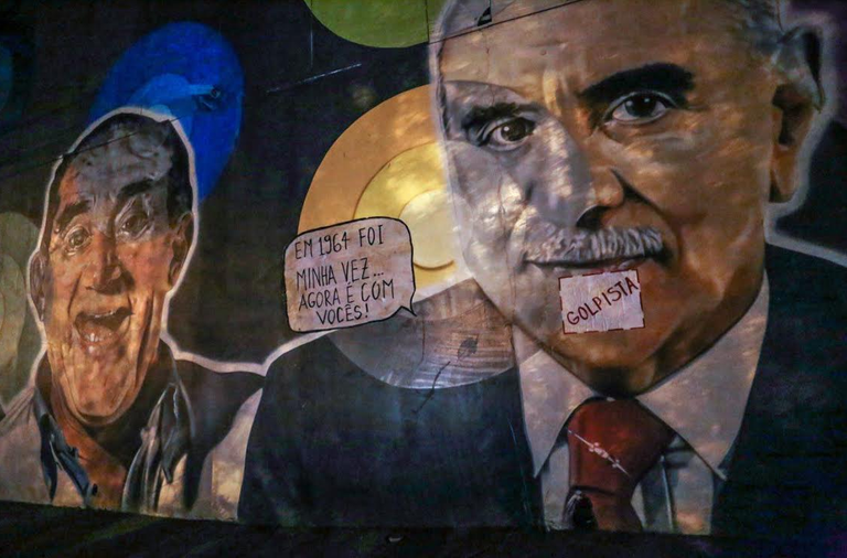 O mural em homenagem a Rede Globo amanheceu diferente na manhã de hoje (17), na marginal Tietê, em São Paulo (SP). O Levante Popular da Juventude realizou uma intervenção no mural criado para comemorar os 50 anos da emissora, colocando balões de conversa nas imagens de Roberto Marinho, William Bonner e Luciano Huck com as frases “Em 1964 foi a minha vez, agora é com vocês” e “Fica tranquilo Dr. Roberto! Esse golpe é nosso! Boa noite! “