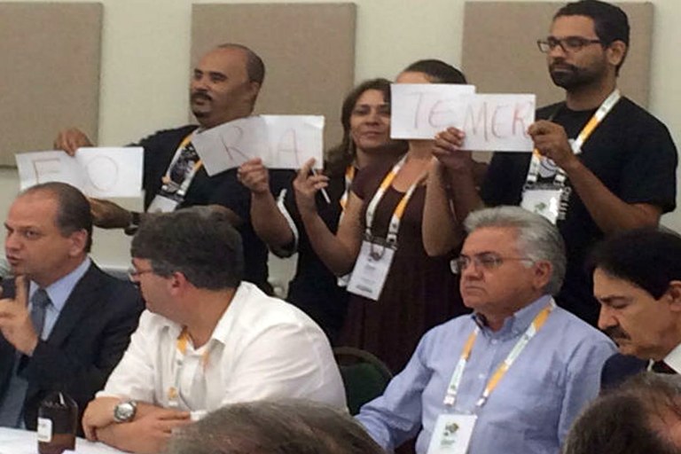 Diversos movimentos da saúde fizeram hoje (1o) um ato contra o ministro da Saúde, Ricardo Barros (PP), durante uma apresentação dele no Congresso Nacional de Secretarias Municipais de Saúde (Conasems), que ocorre até sábado em Fortaleza (CE). Na ação, chamada de escracho, os médicos ergueram uma faixa com a frase “Fora Temer”. O ato faz parte da jornada em Defesa da Democracia e do Sistema Único de Saúde (SUS) que ocorrem ao longo desta semana para denunciar os ataques ao sistema público de saúde.