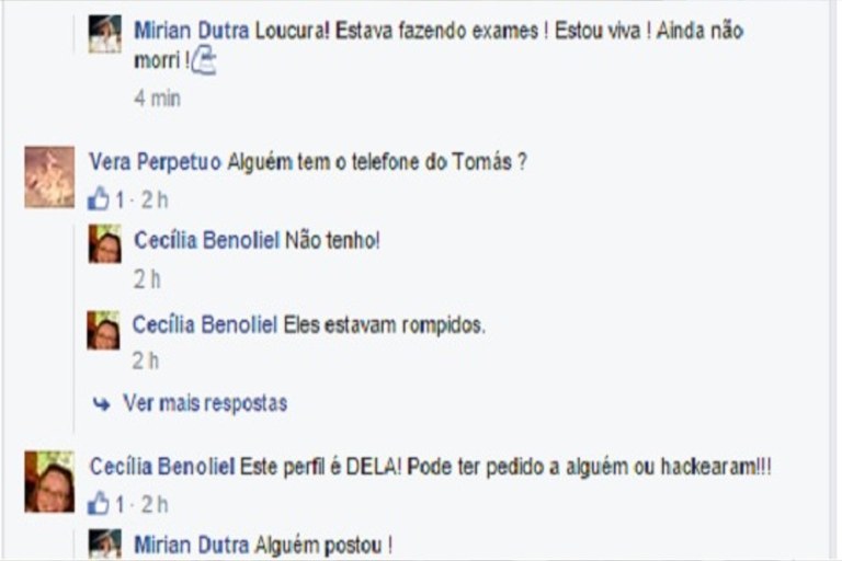 Alguém invadiu seu Facebook. “Loucura! Estava fazendo exames! Ainda não morri!”, escreveu a jornalista. “Alguém postou”.