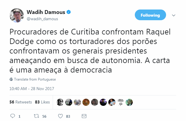 Brasil Você está aqui: Página Inicial / Brasil / Procuradores fazem o desmanche da Dra Dodge Procuradores fazem o desmanche da Dra DodgeDemocracia? Onde? Aqui? Tweet Compartilhar Compartilhar Email publicado 28/11/2017 Comments