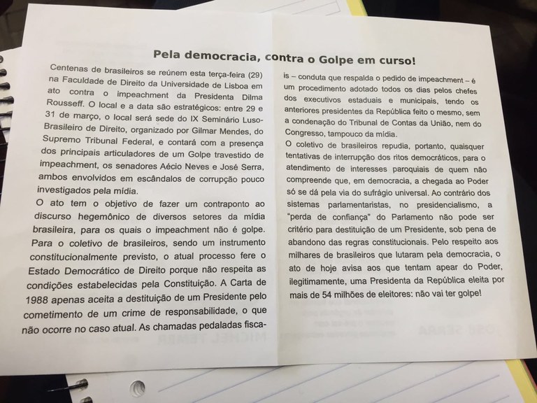 Abaixo, informação de manifestações em defesa da democracia que ocorrem em Lisboa:
