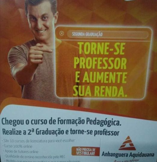 O Conversa Afiada recebeu de amigo navegante a imagem abaixo, que circula nas redes sociais. O apresentador Luciano Huck, em anúncio de uma universidade privada, trata a carreira docente como "complemento de renda"...