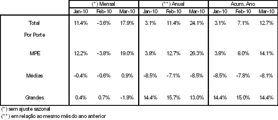 Na classificação por porte, as micros e pequenas empresas se destacaram no mês de março em termos da procura por crédito, crescendo 19,0% em relação ao mês imediatamente anterior (fevereiro/2010). Por terem a sua dinâmica atrelada, fundamentalmente, ao mercado interno, a busca por crédito de micros e pequenas empresas também se destaca no acumulado do trimestre, crescendo 14,1%, praticamente empatando com a alta registrada pelas grandes empresas (14,4%).