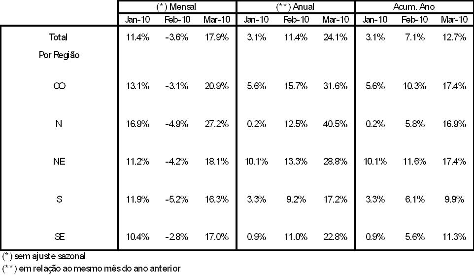 Todas as regiões do país registraram elevação da procura por crédito, por parte de suas empresas, no mês passado. O maior avanço mensal deu-se na região Norte (alta de 27,2% em relação a fevereiro/10) ao passo que a menor alta ficou por conta da região Sul. (crescimento de 16,3%).