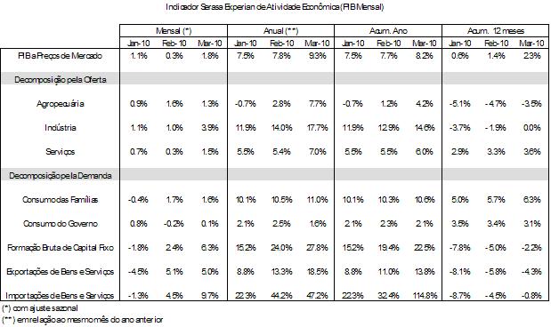 Sob a ótica da demanda agregada, a alta de 9,3% na atividade econômica, considerando a sua comparação anual, foi determinada pelos crescimentos de 27,8% nos investimentos produtivos (formação bruta de capital fixo) e de 11,0% no consumo das famílias. Também as exportações, com avanço anual de 18,5% em março de 2010, contribuíram para este resultado positivo. Na direção contrária, as importações, com elevação anual de 47,2%, contribuíram para reduzir a taxa anual de crescimento da atividade econômica em março.