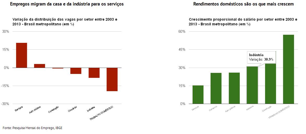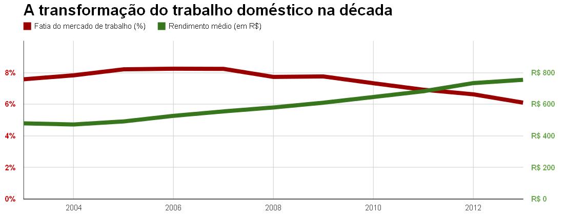 O serviço doméstico é a atividade que mais perdeu peso no mercado de trabalho das metrópoles nos últimos dez anos. Em janeiro de 2013, os trabalhadores domésticos representavam apenas 6% da força de trabalho do País, redução de 19% em relação a 2003. A mão-de-obra doméstica também foi a que teve o maior aumento de rendimento médio no período, de 57%, mas seus ganhos ainda são os menores entre todas as atividades. Os dados são da Pesquisa Mensal do Emprego do IBGE, que cobre as regiões metropolitanas de São Paulo, Rio de Janeiro, Recife, Salvador, Belo Horizonte e Porto Alegre.