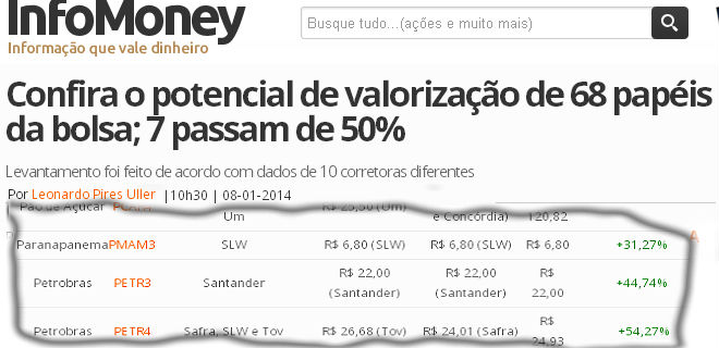 O site Infomoney divulgou hoje o preço-alvo (expectativa de valor) estimado pelas corretoras que não os mantêm em sigilo.