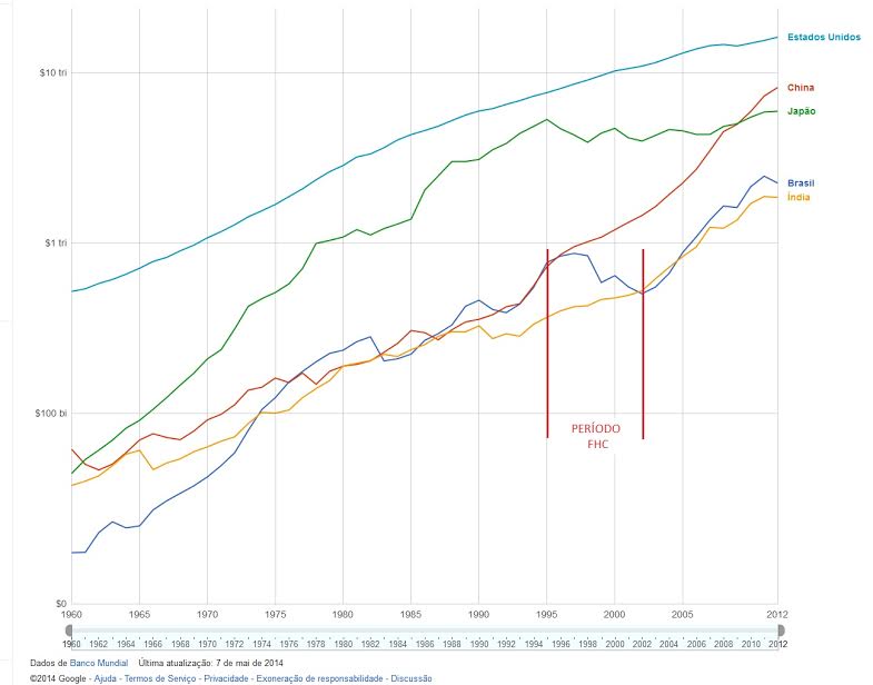 Estava eu navegando pelo oráculo moderno - Google - em busca de números reais frente à tamanha guerra de informações do PiG querendo que a gente coma gato por lebre. Quando vi a comparação histórica dos PIBs de alguns dos principais países do mundo, é indiscutível: Se não fosse o Farol de Alexandria, hoje o Brasil era a China.