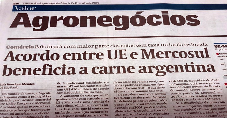 Em 2018, os frigoríficos brasileiros receberam US$ 705,6 milhões ao exportar 116,7 mil toneladas à União Europeia, segundo dados da Secretaria de Comércio Exterior (Secex) compilados pelo Ministério da Agricultura. As exportações da carne argentina, mais valorizada no exterior devido à tradicional qualidade, somaram 47 mil toneladas e renderam US$ 490 milhões, de acordo com dados da indústria local. (...)