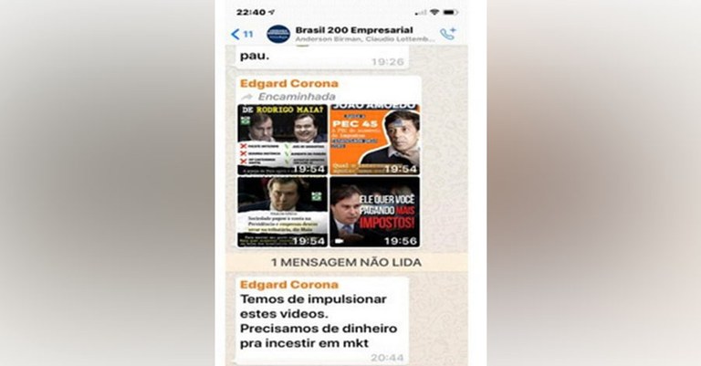 Do Globo - O empresário Edgard Gomes Corona, de 63 anos, dono da maior rede de academias da América Latina, fundador da Bio Ritmo e Smart Fit, pediu em grupo de empresários financiamento para impulsionar mensagens contra o Legislativo. No grupo "Brasil 200 Empresarial", Edgard escreveu que "Temos de impulsionar estes vídeos. Precisamos de dinheiro para investir em mkt", depois de compartilhar pelo menos quatro mensagens contra o presidente da Câmara dos Deputados Rodrigo Maia (DEM). O print foi apresentado por Alexandre de Moraes em sua decisão que deflagou a operação desta quarta-feira.