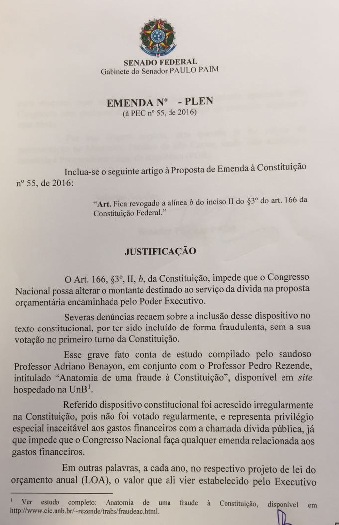 O Conversa Afiada oferece ao amigo navegante essa proposta de Emenda Constitucional que altera um trecho da Constituição - artigo 166, parágrafo 3o. , II, b - que não foi votado pelos constituintes (!!! - ler em tempo) e proíbe o Congresso de mexer no que o Tesouro paga aos bancos.