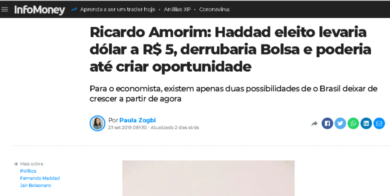 Não se pode, no entanto, deixar de reconhecer o esforço de gente como o economista Ricardo Amorim, que ganha a vida como consultor financeiro, ao dar verniz de verdade absoluta às suas preferências políticas. Em 23 de setembro de 2018, pouco antes das eleições, ele afirmou que “uma eventual eleição de Fernando Haddad (PT) como presidente do Brasil pode criar um estresse no mercado brasileiro”. Uma previsão e tanto! Só que não…