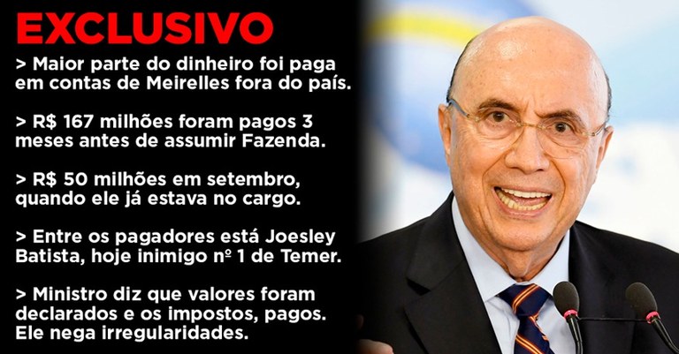 Homem mais poderoso da economia do país, o ministro da Fazenda Henrique Meirelles recebeu, três meses antes de assumir a pasta, R$ 167 milhões em contas que ele mantinha no exterior e que foram usadas para receber pagamentos de grandes empresas, incluindo a J&F, do delator Joesley Batista.