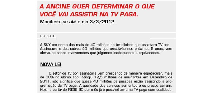 “Tive conhecimento da Campanha que a empresa SKY está promovendo contra a Lei 12.485/11, novo marco regulatório para o setor de áudio visual. Considero que não há porque alegar inconstitucionalidade ou ilegalidades em uma lei que tramitou no Congresso Nacional por mais de quatro anos, sendo três anos na Câmara e mais de um ano no Senado Federal. Passou pela Comissão de Constituição e Justiça nas duas Casas. Foi amplamente debatida, em cinco audiências públicas com participação dos vários setores sociais interessados no tema.