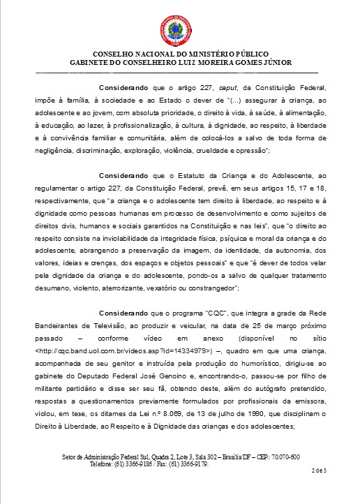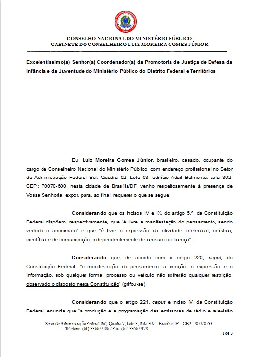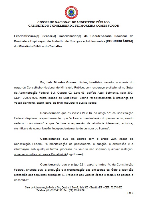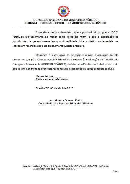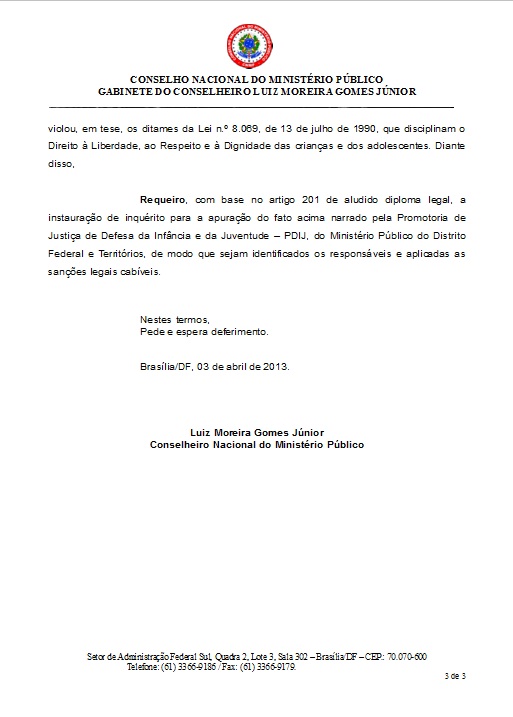 O dr. Luiz Moreira, conselheiro do Conselho Nacional do Ministério Público (clique aqui para ver que o brindeiro Gurgel fez de tudo para evitar que isso acontecesse), informa que encaminhou representações ao MP do Trabalho/DF (sobre os aspectos trabalhistas) e ao MP do Distrito Federal (sobre o Estatuto da Criança e do Adolescente)