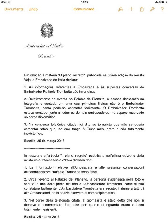 PIG Você está aqui: Página Inicial / PIG / Itália cospe na Veja Itália cospe na VejaDesmentido vem em menos de 24 horas... Tweet Compartilhar Compartilhar Email publicado 25/03/2016 Comments Saiu no DCM: Veja é desmentida em menos de 24 horas pela embaixada da Itália
