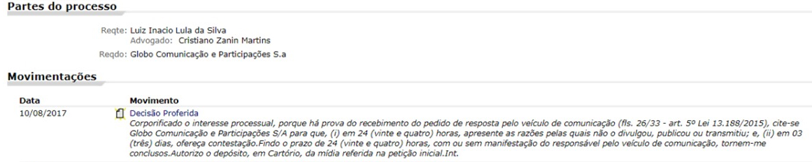 Na condição de advogados do ex-Presidente Luiz Inácio Lula da Silva fizemos hoje (09/08) o protocolo de pedido de direito de resposta contra TV Globo perante a Justiça Cível de São Bernardo do Campo. O pedido foi baseado na reportagem exibida em 16/07/2017 pelo programa “Fantástico”.