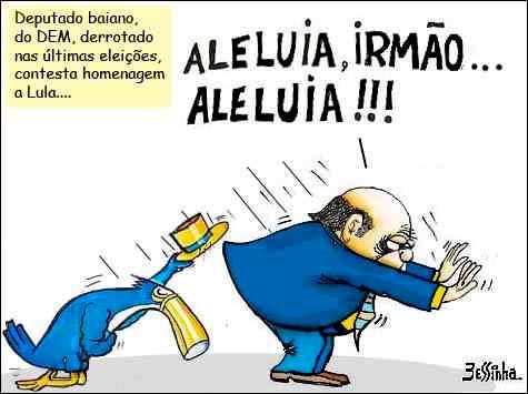 Ele foi um oposicionista inquieto, ocupando, sempre que podia, a tribuna, no ataque ao governo passado, dentro da linha sem rumo e sem prumo do DEM. Aleluia considera uma ofensa às instituições acadêmicas o titulo concedido a Lula, e faz referência elogiosa à mesma homenagem prestada ao professor Miguel Reale. Esqueceu-se, é certo, de outros brasileiros honrados pela vetusta universidade, como Tancredo Neves. Não é preciso conhecer a teoria de Freud para compreender a escolha da memória de Aleluia.
