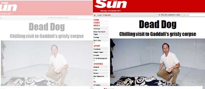 Mas pior, muito pior é o que fizeram os “civilizados” ocidentais, que sustentaram este desfecho monstruoso, que em nada fica a dever às piores acusações que se faz ao morto, em seus 40 anos de poder. Não me refiro à morbidez da mídia, ao ponto de um jornal inglês ter mandado um repórter à Libia para posar ao lado do corpo já – segundo a própria Reuters – em decomposição. Por respeito aos leitores, reproduzo a foto de capa encobrindo parte da cena com outro recorte do mesmo jornal, este de março, onde o primeiro-ministro de Sua Majestade diz que quer o “Cachorro Louco” vivo ou morto.