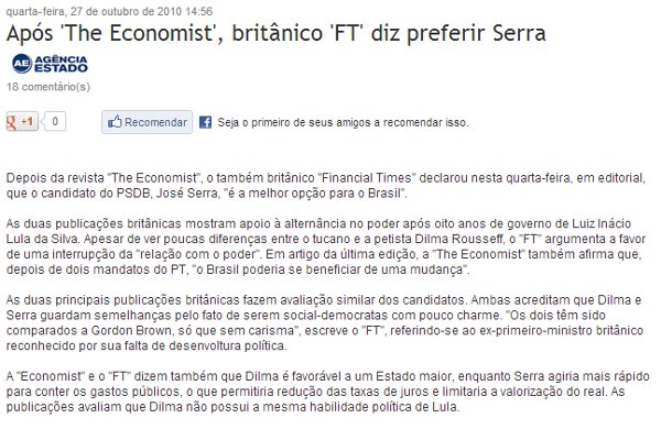 Aliás, como insinua o enunciado deste texto, a má vontade do jornal e da revista britânicos com Dilma começou antes de ela assumir a Presidência. Na última eleição presidencial, tanto The Economist quanto Financial Times, em editoriais, declararam apoio oficial a José Serra.