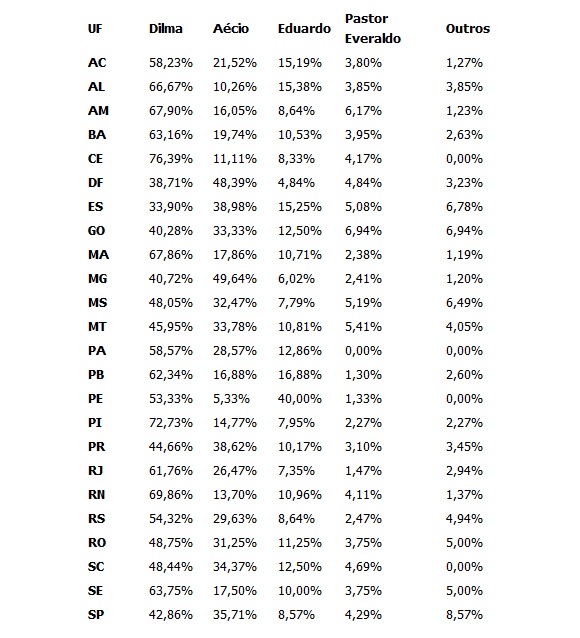 Por isso, decidimos compilar os votos válidos (excluídos indecisos, brancos e nulos) de várias pesquisas estaduais para presidente da República, entre as quais as do Ibope, Veritá, Datatempo, entre outros institutos.