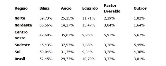 No Nordeste, Dilma teria quase 11,5 milhões de votos a mais que Aécio e no Norte mais de 1,8 milhões. Na região Sul, a diferença seria de quase 2 milhões, no Centro- Oeste, de 390 mil votos. Já na região Sudeste, Dilma teria 2,6 milhões de votos a mais.