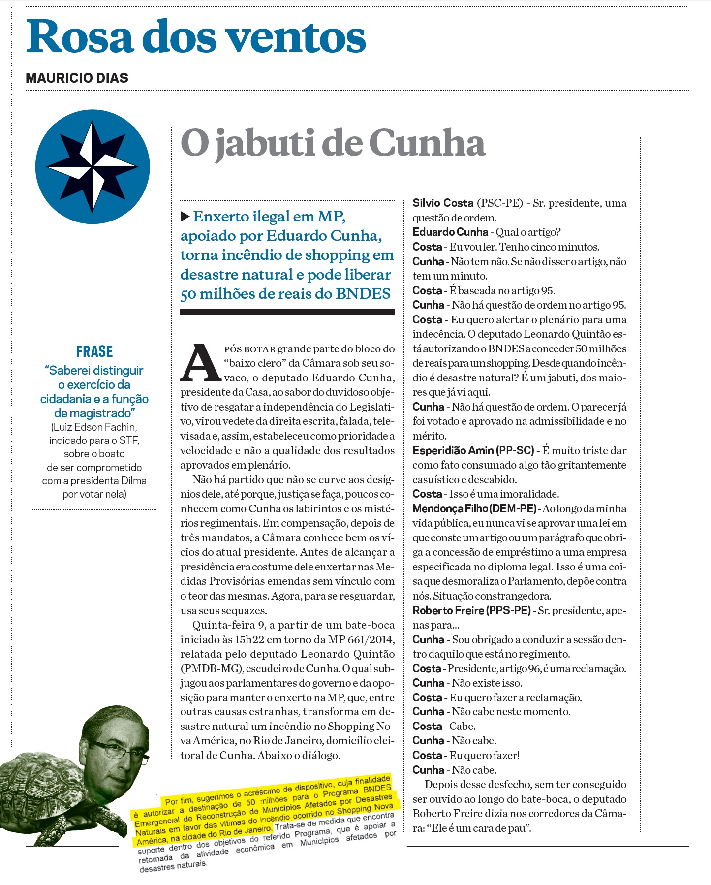Política Você está aqui: Página Inicial / Política / 2015 / 04 / 17 / Dias: Cunha vai em todas ! Dias: Cunha vai em todas !Até o Roberto Freire se indignou ! O Roberto Freire ! Tweet Compartilhar Compartilhar Email publicado 17/04/2015 Comments O Conversa Afiada reproduz denúncia impressionante do Mauricio Dias, na imperdível "Rosa dos Ventos", na Carta Capital:
