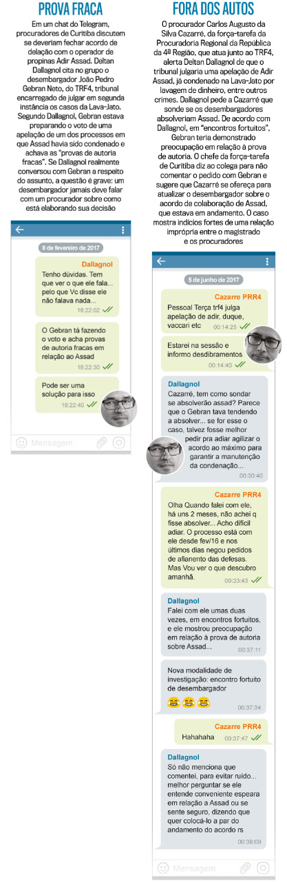 Cinco meses antes do julgamento do caso em segunda instância no TRF4, o procurador Deltan Dallagnol, chefe da força-tarefa em Curitiba, comenta em um chat com outros colegas do MPF: “O Gebran tá fazendo o voto e acha provas de autoria fracas em relação ao Assad”. O assunto é tema de outra conversa, de 5 de junho de 2017, entre Dallagnol e o procurador Carlos Augusto da Silva Cazarré, da força-tarefa da Procuradoria Regional da República da 4ª Região, que atua junto ao TRF4. No diálogo, ocorrido às vésperas do julgamento da apelação de Assad, Dallagnol mostra-se novamente preocupado com a possibilidade de Gebran absolver o condenado. Naquele momento, em paralelo, a força-tarefa negociava com o condenado um acordo de delação (esse acordo seria fechado em 21 de agosto de 2017). Daí a preocupação do MPF com a possibilidade de Assad ser absolvido e voltar atrás nas conversas sobre delação. No chat, Dallagnol aciona Cazarré, que fica em Porto Alegre, sede do TRF4. “Cazarré, tem como sondar se absolverão assad? (…) se for esse o caso, talvez fosse melhor pedir pra adiar agilizar o acordo ao máximo para garantir a manutenção da condenação…”, escreve Dallagnol. “Olha Quando falei com ele, há uns 2 meses, não achei q fisse (sic) absolver… Acho difícil adiar”, responde Cazarré. Na sequência, Dallagnol volta a citar Gebran: “Falei com ele umas duas vezes, em encontros fortuitos, e ele mostrou preocupação em relação à prova de autoria sobre Assad…”. Dallagnol termina pedindo ao colega que não comente com Gebran o episódio do encontro fortuito “para evitar ruído”.
